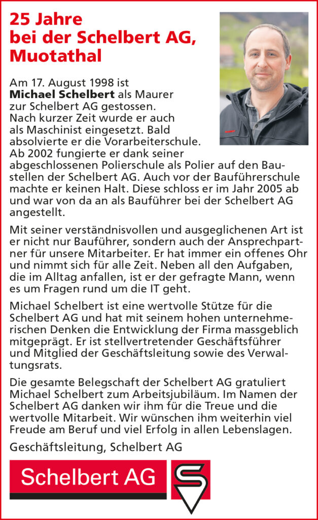 Wir gratulieren! Michael Schelbert 25 Jahre bei der Schelbert AG, Muotathal! Steve Stoll2023-08-18T13:54:54+02:00